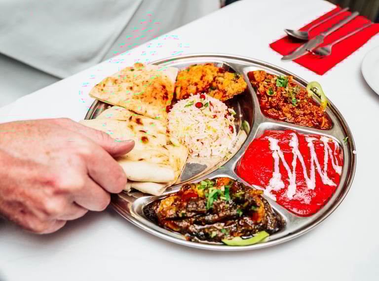 A generous platter featuring succulent chicken tikka, tender lamb tikka, rich meat bhuna, spiced kofta with spinach, and tangy Bombay aloo, all served with fragrant rice and warm naan. An irresistible combination for meat lovers.